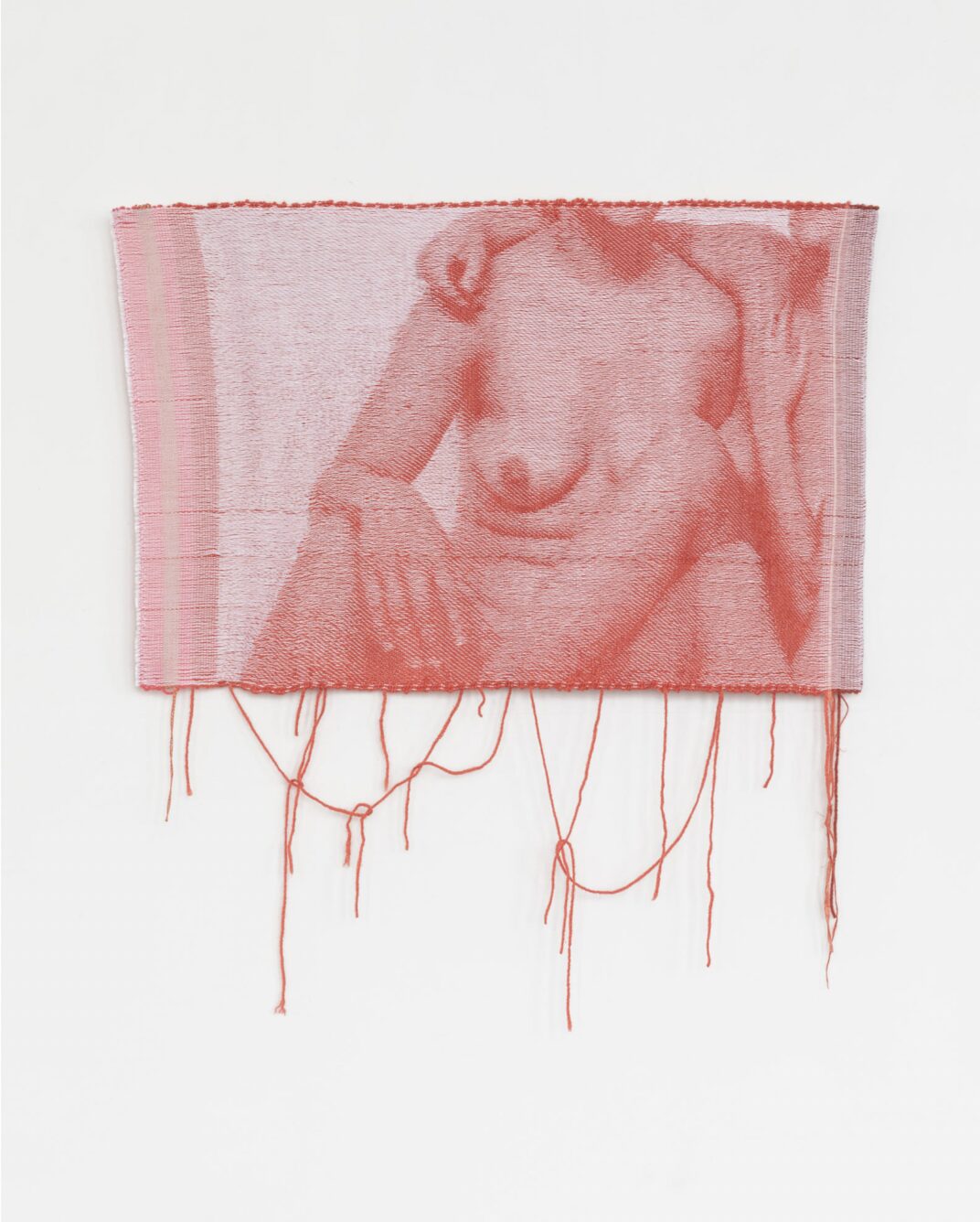 “I engage in histories of portraiture, using my own body in each weaving along with the models that I choreograph. The photographs are then digitally manipulated before being handwoven – body parts are removed, coded objects added, color and contrast shifted. Visibility, time and place are complicated and confused. As the photograph is transformed into cloth, each pixel becomes a crossing of tensioned threads, and the relationship between object and image begins to equalize as the digital becomes haptic. Mostly monochromatic, the works sometimes shift in color unexpectedly or include the visual markers of production or glitch. These glitches and breaks in image become moments for queerness to seep into the cloth and a new point of access and intimacy. My work is about connection, both between bodies and cloth as a shared experience.”