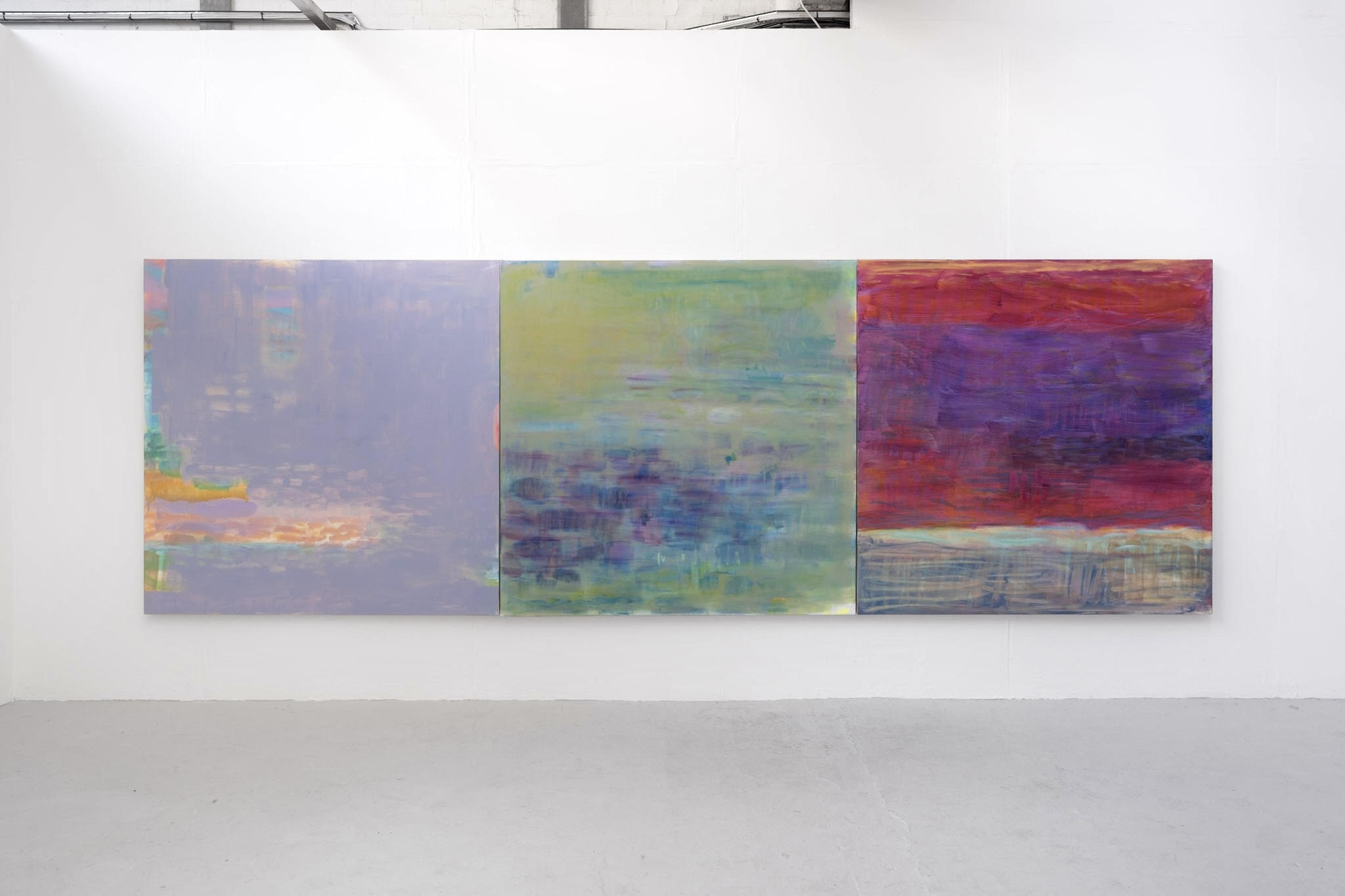 Many of her paintings are titled after the songs or song lyrics that inspired them, reinforcing the ongoing interplay between sound and image. For Gilpin, painting becomes a way to process the world when language falls short. Her practice is as much about formal concerns – rhythm, depth, transparency, as it is about perception, sensation, and the experience of being. Paintings frequently play with perception, using layering to prompt the viewer to ask, “Which colour was applied first?” They invite close looking, drawing the eye to underpainting and traces of past gestures. To create an immersive experience, Gilpin often installs her larger works low on the wall.