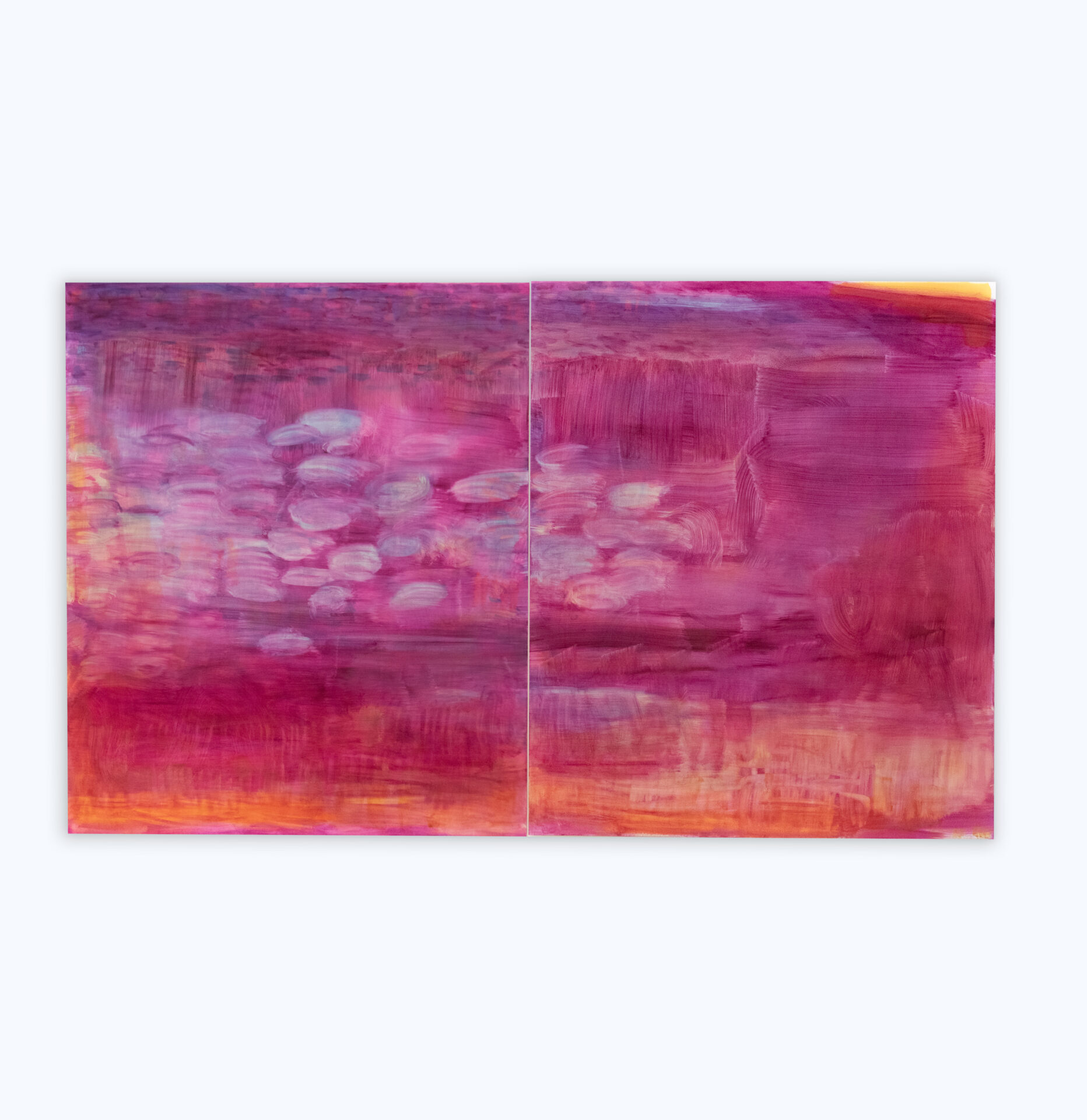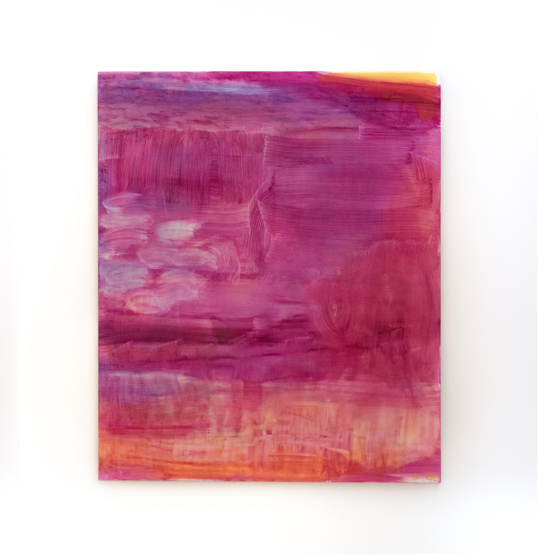 I tend to paint in short quick bursts – intense, fast moments followed by pauses to step back and see what’s happening. I might have a notion of the look of a painting as I start, only for it to look completely different at the end.That shift becomes the most exciting part. That unpredictability keeps me excited, not knowing exactly where it’s going to go. An artist friend once told me that Philip Guston used to paint his abstract paintings really close to the canvas, without stepping back to look. I love that image – I’d also find that impossible to do – I spend more time looking at my painting than I do painting on it.