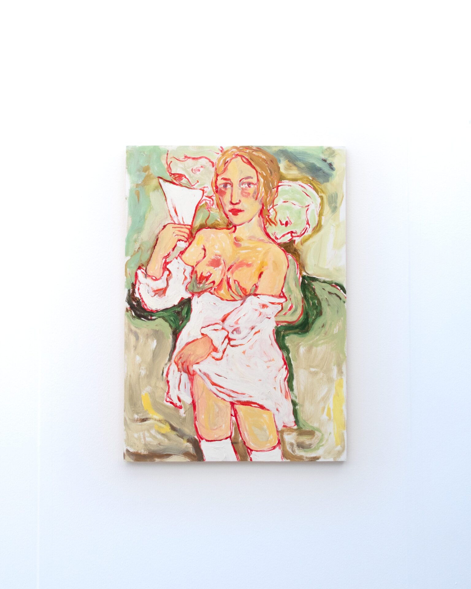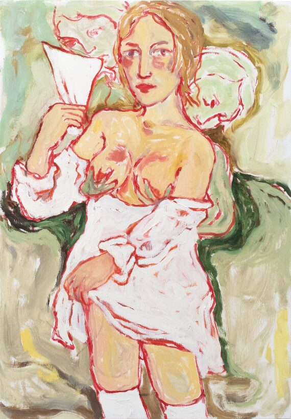 Joline Kwakkenbos (b. 1997, Hilversum, NL) is a Dutch artist known for her expressive self-portraits that explore themes of queerness, femininity, and the human experience. Her work, ranging from free-spirited depictions to contemplations of seduction, societal roles, and vulnerability, employs vibrant colours and subtle symbolism to invite viewers into her world. With a BA in fashion design, Kwakkenbos’ artistic practice fuses painting, experiments with clothing and historical research, as a means of self-reflection while challenging societal norms of femininity and body perception. Since 2024, she has been based in Margate, residing in Tracey Emin’s studios.