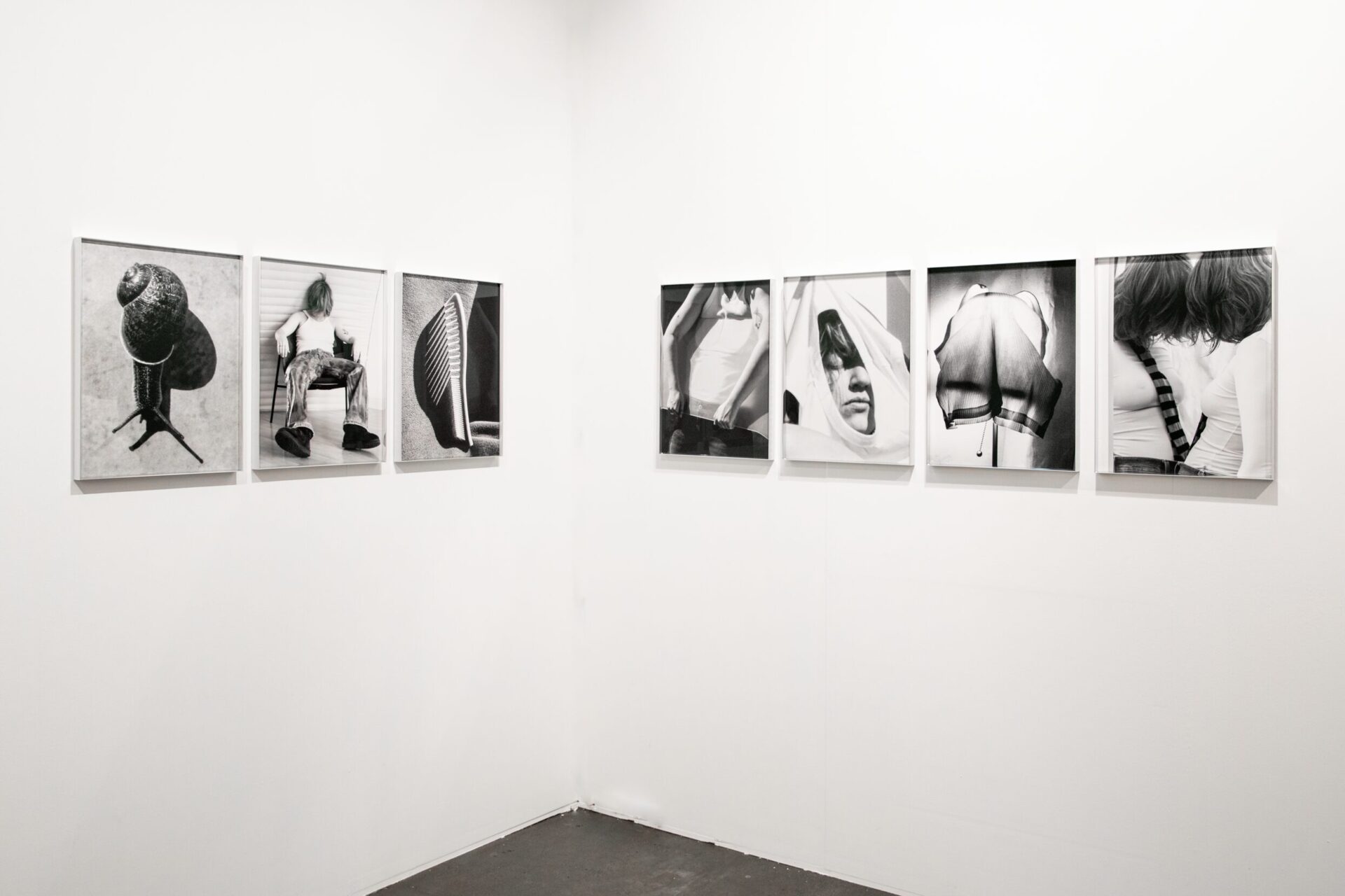Loes de Boer’s (b. 1999, NL) black-and-white still-life photographs are sequences of self-portraits, mirrors of her own life and the objects that surround or transform her.
