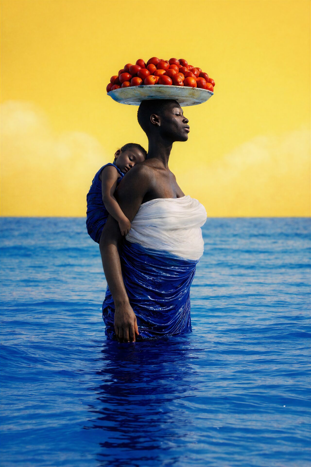 A mother stands in the water with her child resting on her back while balancing a tray of fruit upon her head. The body holds three burdens at once, life, nourishment, and endurance yet the posture remains calm.