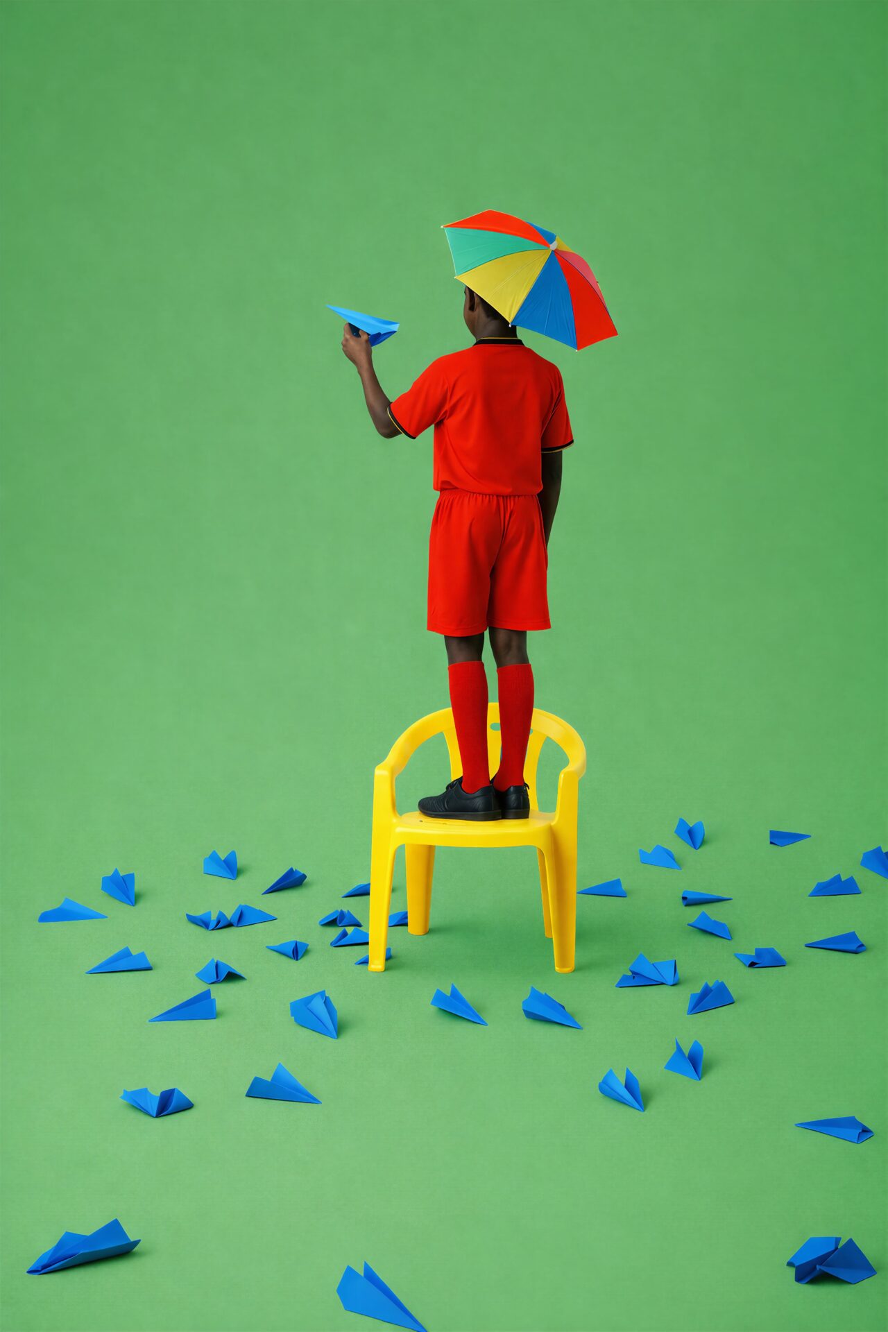 A child stands on a yellow chair, reaching upward with a paper airplane while surrounded by many that have already fallen. Hueism recognizes this moment as the space between attempt and becoming.